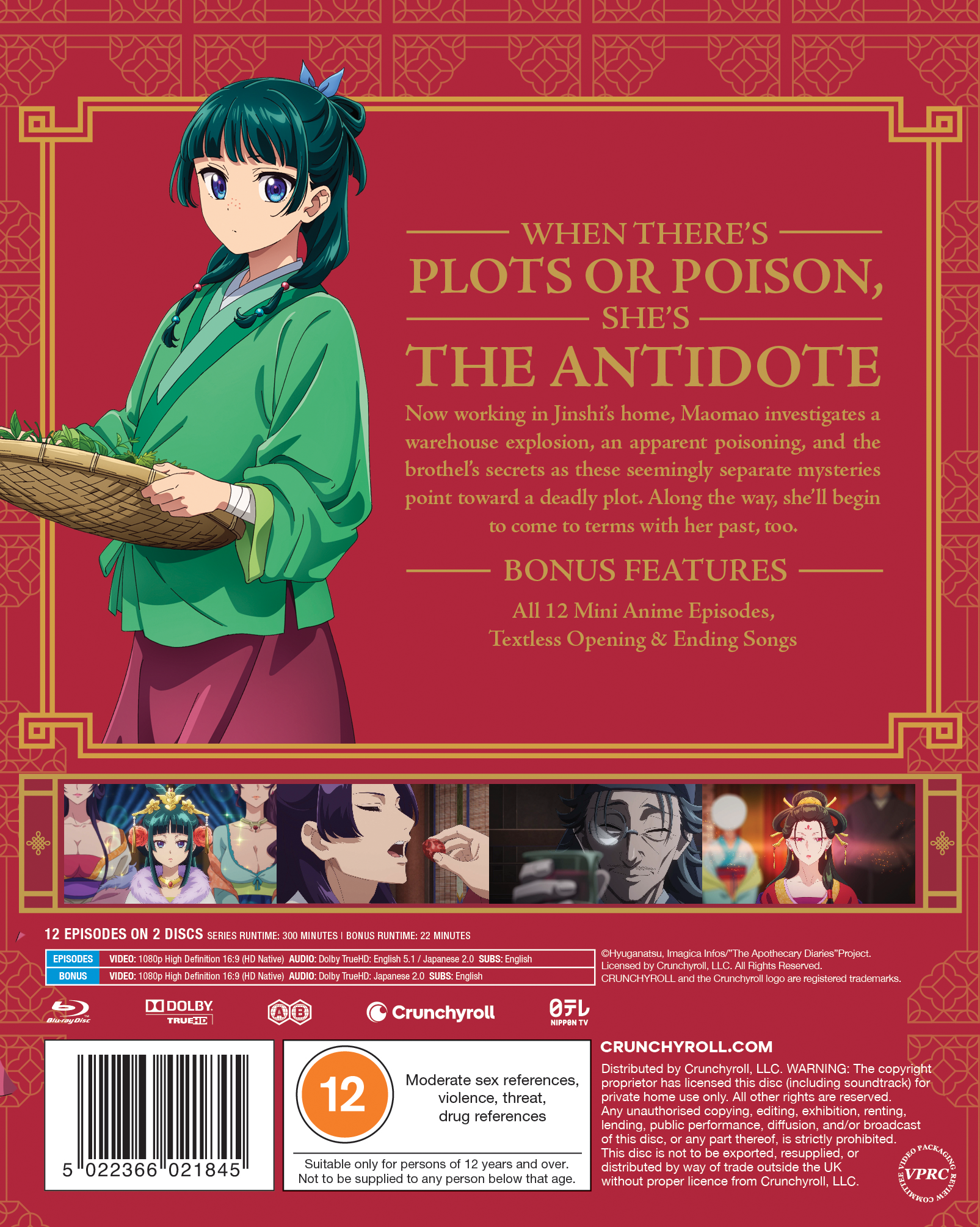 Now working in Jinshi’s home, Maomao investigates a warehouse explosion, an apparent poisoning, and the brothel’s secrets as these seemingly separate mysteries point toward a deadly plot. Along the way, she’ll begin to come to terms with her past, too.